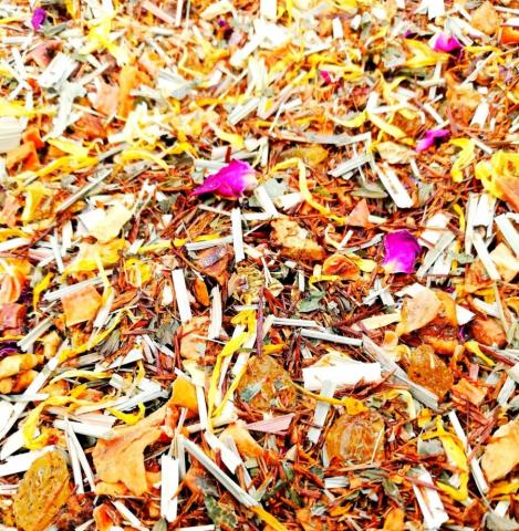 Koostisosad: punane rooibos (40%), õun, sidrunhein, rosin, apelsinikoor, külmkuivatatud apelsin, porgand, piparmünt, saialilleõis, granadill, roosiõis.