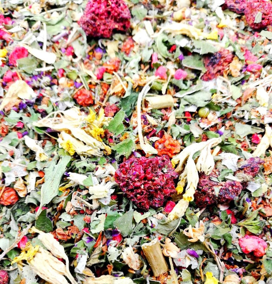 Koostisosad: pihlakamari, vaarikaleht ja – mari, pärnaõis, põdrakanepileht, pune, õun, piparmünt, nurmenukuõis, nõmm – liivatee, külmkuivatatud vaarikamari.
