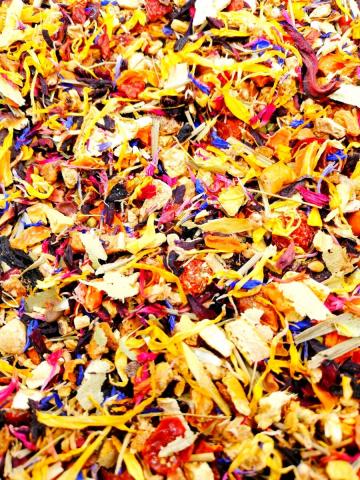 Koostisosad: ingverijuur( 15%), hibiskuseõis, puhastatud kibuvitsamari, sidrunhein, õun, pärnaõis, porgand, apelsinikoor, saialilleõis, rukkililleõis, tšilli.